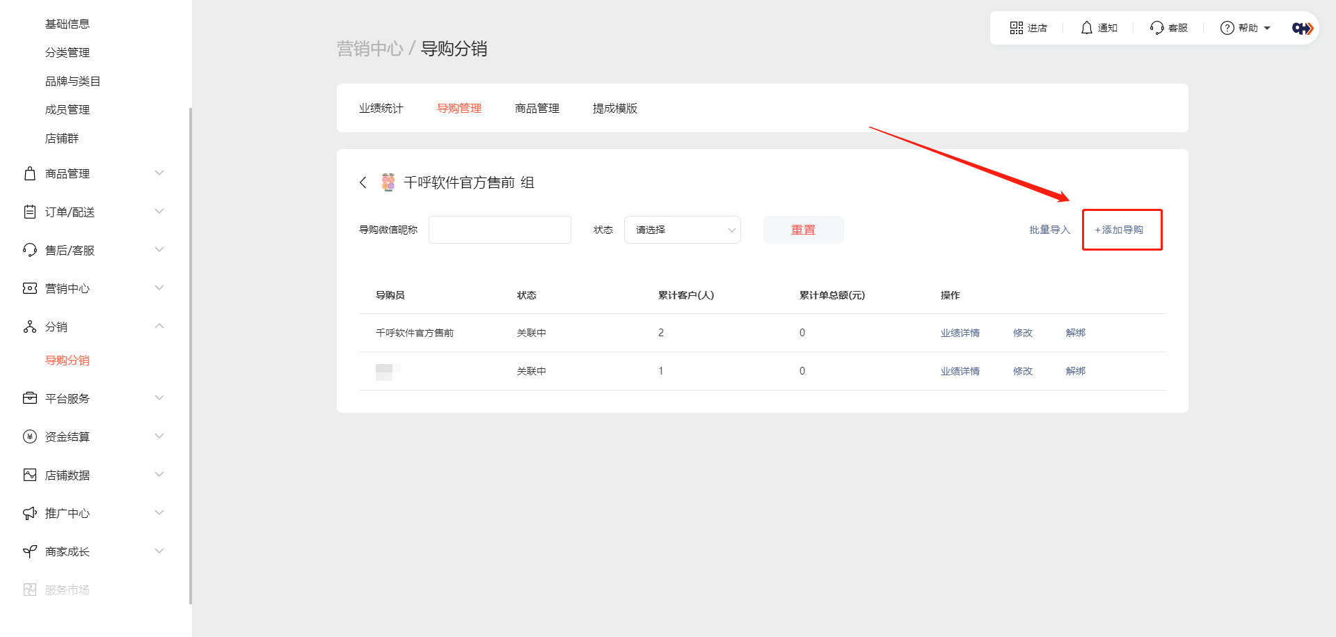 5.点击设置好的导购群组,点击添加导购,输入微信号添加最终导购员,并设置适用的提成模板。