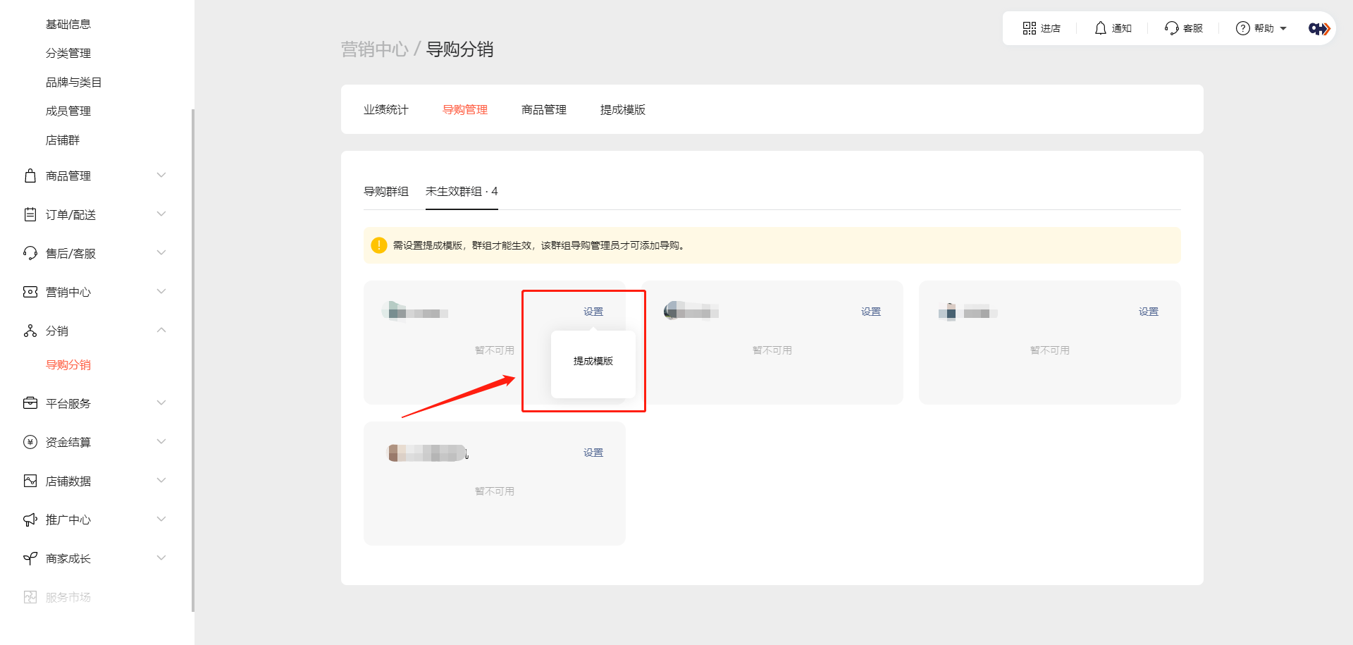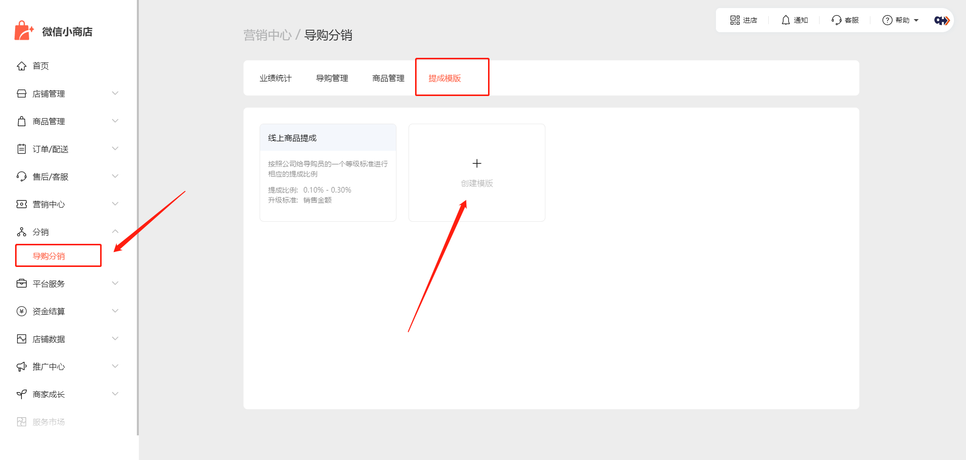 2.在小商店pc后台左侧菜单栏点击“分销”→“导购分销”,然后首先设置提成模板,按照自己的需求设定,如下图: