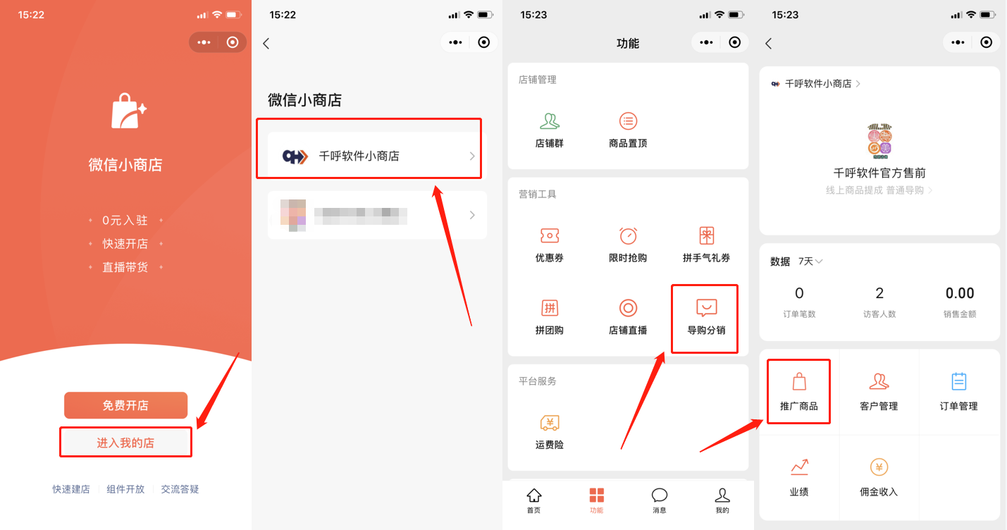 如果导购也是小商店管理员,那么此小商店不会显示导购,点击进入还是会进入此小商店的手机端管理总后台,此时需要在“功能”→“营销工具”→“导购分销”中点击进入分销员管理后台。