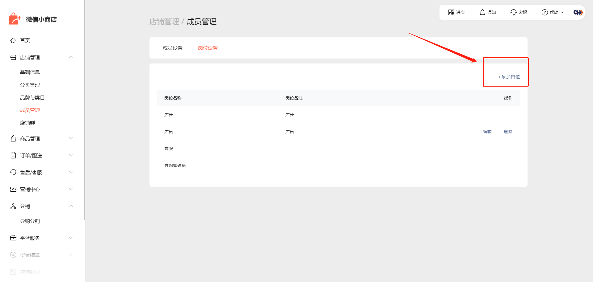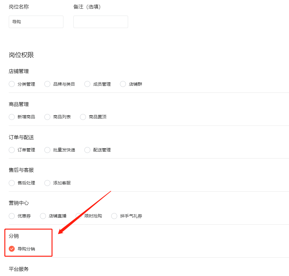 1.首先在小商店pc端后台左侧菜单栏“店铺管理”→“成员管理”→“导购设置”添加导购岗位,其中一定要勾选导购分销项,如下图: