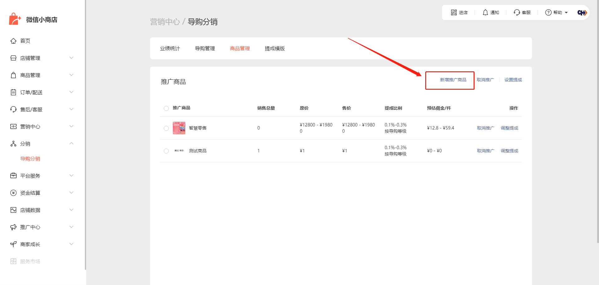 3.在“导购分销”→“商品管理”设置需要推广分销商品。如图点击设置适用刚才设置的分销提成模板