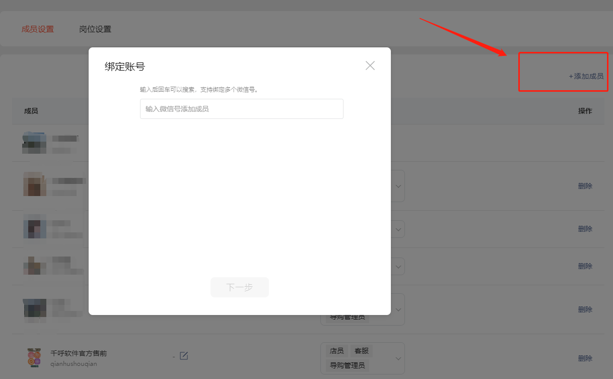 然后在成员设置中点击添加成员,输入导购管理员的微信号后为他设置刚才的导购岗位,如下图: