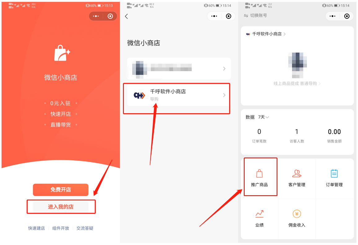 6.此时已经全部设置完毕,导购可以在小程序“小商店助手”→“进入我的店”→点击有“导购”标识的小商店直接进入导购员管理中心,可以进行商品分享和数据查看等操作。
