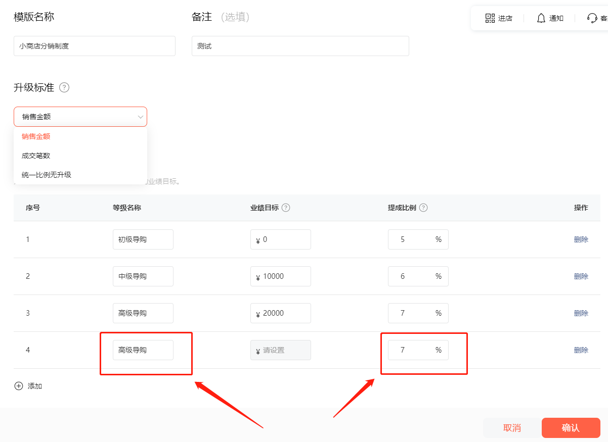 其中升级标准有按照销售总额和销售笔数来定,或者统一没有级别设置。注意,目前在设置导购级别的最后一级时有一个小bug,需要再新增一个级别并且名称和比例与上级填写一致,这样才能设置成功,不然最后一级会设置失败。(这个操作是在向小商店官方客服反馈时得到的解决方案,在官方修复前应该只能这样操作)如下图: