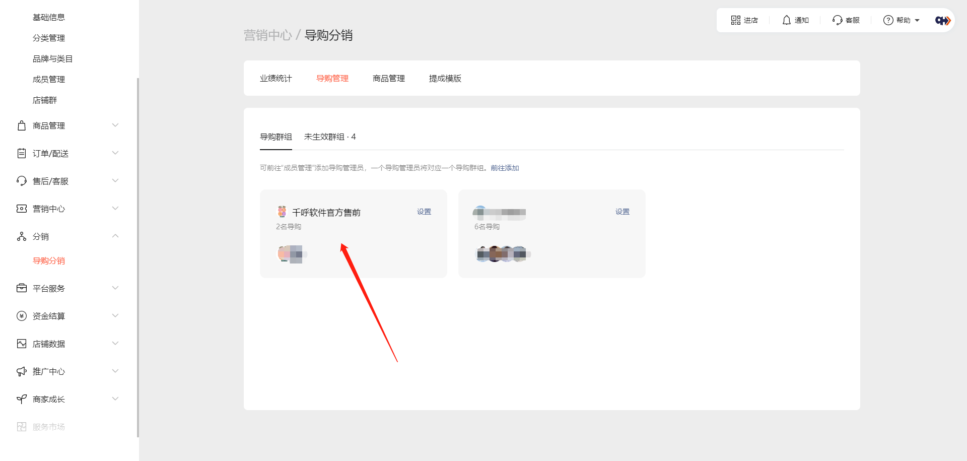 4.在“导购分销”→“导购管理”→“未生效群组”中,选择刚才添加微信号并设置导购岗位的员工,选择刚才设置的提成模板后导购群组生效。如下图: