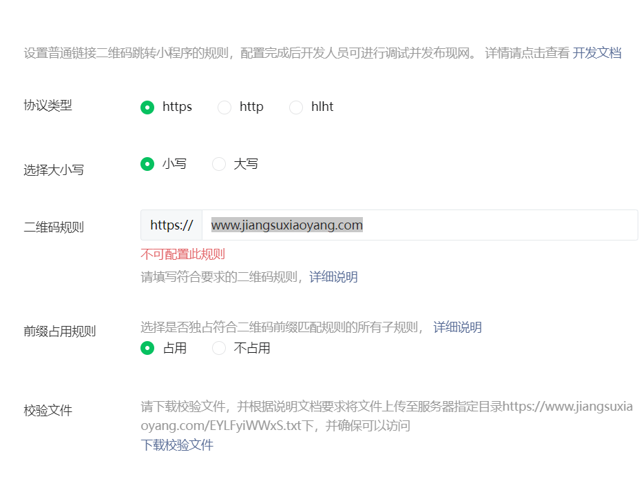 扫普通链接二维码打开小程序二维码规则,设置时提示:不可配置此规则?小程序业务,主要用于售货机!域名没有问题,通过微信审核了,网址也是按官方的标配,就是一直提示 不可配置此规则!!!!!!!!!!!