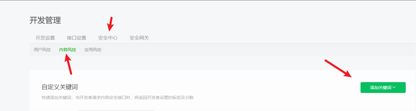 开发者登录小程序管理后台,可在【开发与服务→开发管理→安全中心→内容风控】进行自定义关键词的配置。