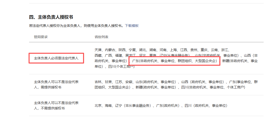 广东(事业单位、群团组织、大型国企央企)主体负责人可以不是法定代表人,需提供授权书;
