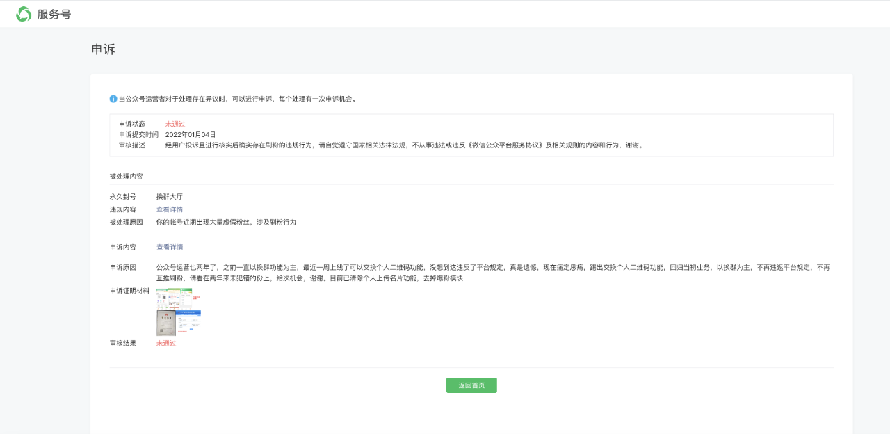 公众号名称是:换群大厅,当时什么都不懂,我只是个程序员,在原单位离职后,注册了这个公众号,由于不懂规则被封了,三年了,早已过了认证期,现在想重新认证这个公众号,对于之前的违规是:你的帐号近期出现大量虚假粉丝,涉及刷粉行为,因为当时换群的多,流量上来了,被误判刷粉,还请再给一次申诉的机会,十分感谢!