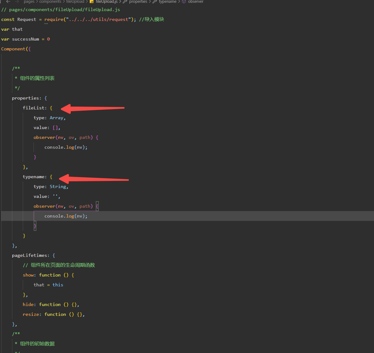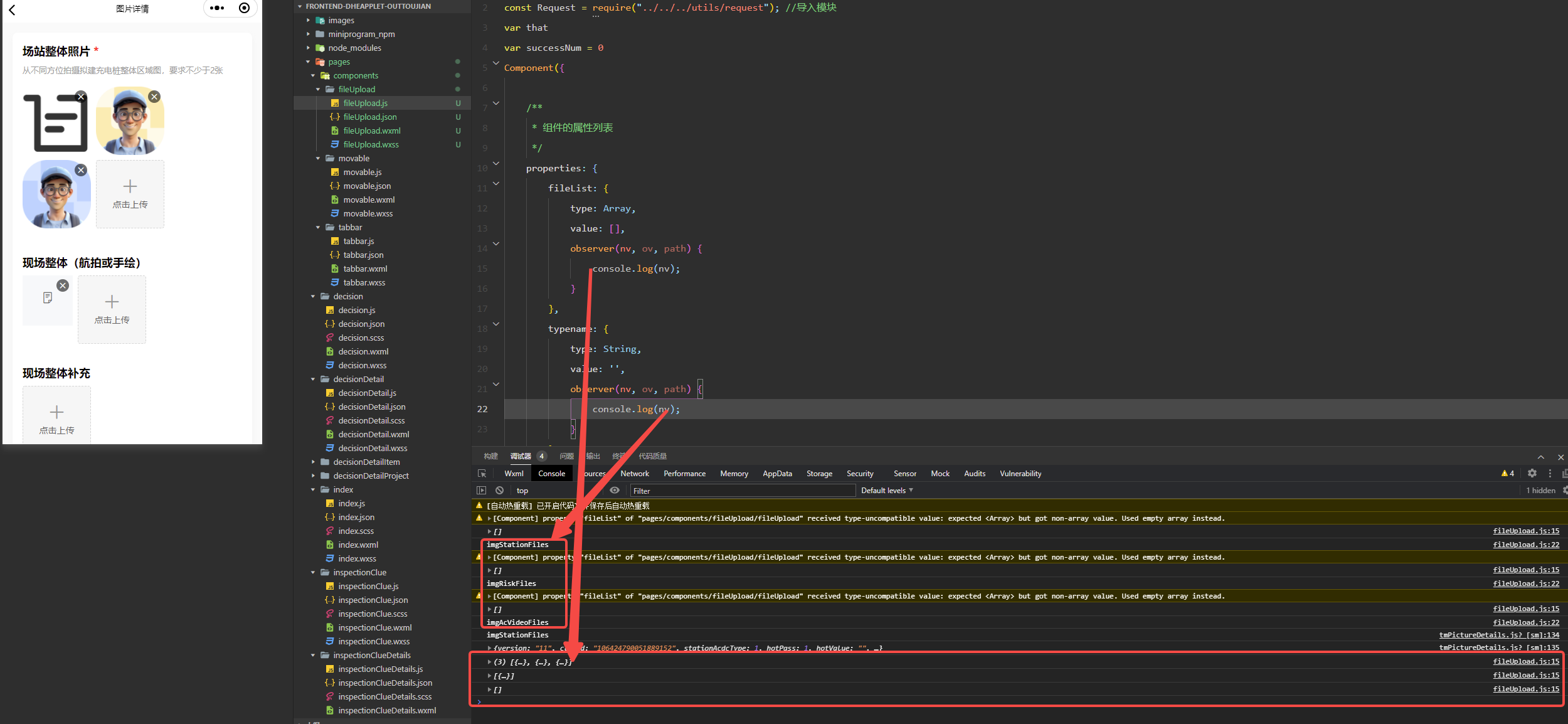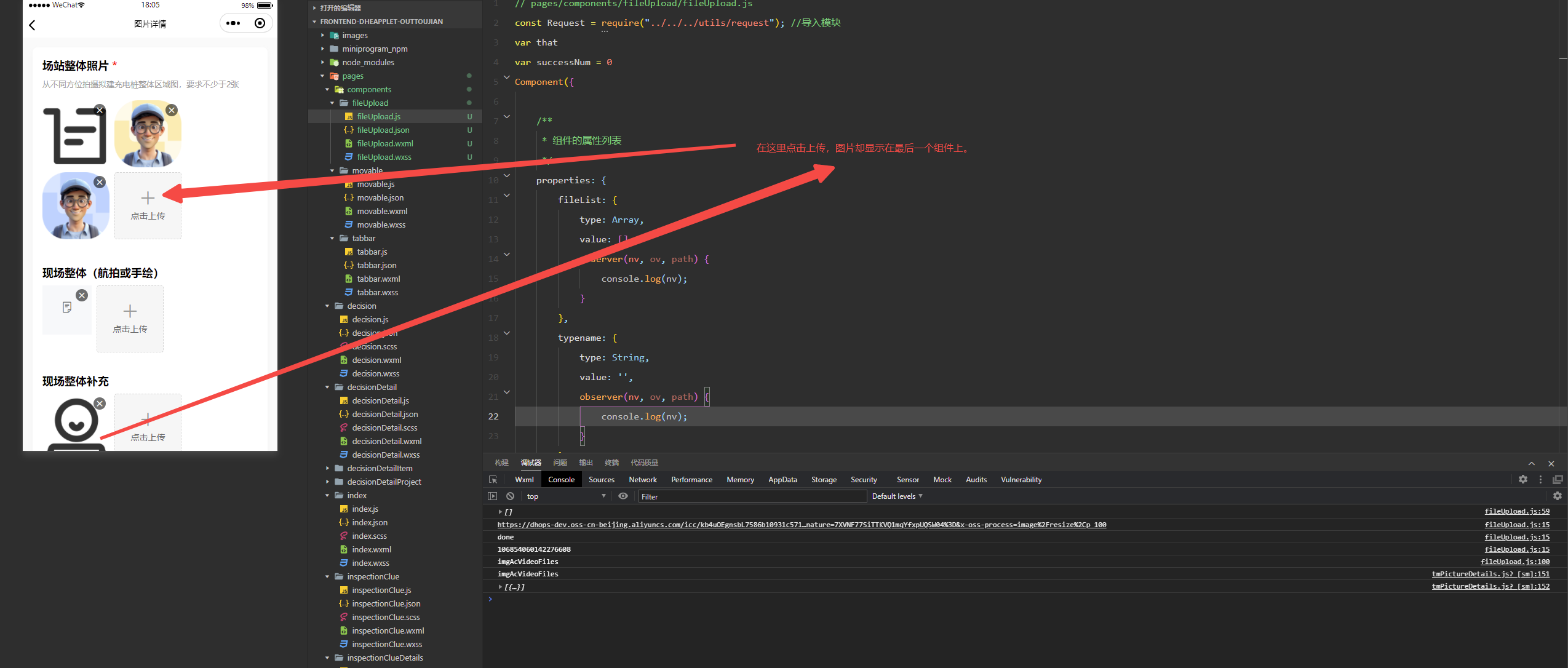 父组件 <view class="createtask"> <view class="cttitle">场站整体照片<text>*</text></view> <view class="desc">从不同方位拍摄拟建充电桩整体区域图,要求不少于2张</view> <mp-fileupload typename="imgStationFiles" fileList="{{formdata.imgStationFiles}}" bindsendMsg="sendMsg"></mp-fileupload> <view class="cttitle" style="margin-top:60rpx">现场整体(航拍或手绘)</view> <mp-fileupload typename="imgRiskFiles" fileList="{{formdata.imgRiskFiles}}" bindsendMsg="sendMsg"></mp-fileupload> <view class="cttitle" style="margin-top:60rpx">现场整体补充</view> <mp-fileupload typename="imgAcVideoFiles" fileList="{{formdata.imgAcVideoFiles}}" bindsendMsg="sendMsg"></mp-fileupload> </view> 子组件 <!--pages/components/fileUpload/fileUpload.wxml--> <view class="uploaderbox"> <van-uploader accept="media" max-count="20" multiple file-list="{{ fileList }}" bind:delete="deleteRead" bind:after-read="afterRead"> <view class="uploader"> <!-- <van-icon class="plus" name="plus" /> --> 点击上传 </view> </van-uploader> </view> // pages/components/fileUpload/fileUpload.js const Request = require("../../utils/request"); //导入模块 var that var successNum = 0 Component({ /** * 组件的属性列表 */ properties: { fileList: { type: Array, value: [], observer(nv, ov, path) { console.log(nv); } }, typename: { type: String, value: '', observer(nv, ov, path) { console.log(nv); } } }, pageLifetimes: { // 组件所在页面的生命周期函数 show: function () { that = this }, hide: function () {}, resize: function () {}, }, /** * 组件的初始数据 */ data: { // fileList: [] }, /** * 组件的方法列表 */ methods: { afterRead(event) { const { file } = event.detail; for (let i = 0; i < file.length; i++) { if (file[i].duration && file[i].duration < 5) { wx.showToast({ title: '视频不能小于5秒', icon: "none", mask: true, }) return } } console.log(that.data.fileList); const fileList = that.data.fileList //获得这次上传的图片数量,上传时避免重复上传之前传过的文件 const thatNum = file.length const beforeNum = fileList.length const totalNum = thatNum + beforeNum //还没上传时将选择的图片的上传状态设置为加载 for (let j = 0; j < thatNum; j++) { file[j].status = 'uploading' fileList.push(file[j]) } that.setData({ fileList }) //上传服务器 for (let i = beforeNum; i < totalNum; i++) { that.uploadImg(i, that.data.fileList[i].url, that, thatNum) } }, uploadImg(fileListIndex, fileURL, that, thatNum) { //上传文件 const filePath = fileURL // 小程序临时文件路径 wx.uploadFile({ url: `${Request.apiHttp}/psp/api/ifs/upload`, filePath: filePath, name: 'dhefile', header: { 'dhetoken': wx.getStorageSync("UserSessionId"), }, formData: { appCode: 'icc' }, success(res) { successNum++ var tem = JSON.parse(res.data) // 上传完成需要更新 fileList that.setData({ [`fileList[${fileListIndex}].url`]: tem.data.httpUrl, [`fileList[${fileListIndex}].status`]: 'done', [`fileList[${fileListIndex}].id`]: tem.data.id }) console.log(that.data.typename); if (successNum === thatNum) { that.triggerEvent('sendMsg', { fileList: that.data.fileList, typename: that.data.typename }) } }, fail: function (res) { console.log("file upload fail") }, }) }, deleteRead(e) { let fileList_index = e.detail.index //fileList下标 that.data.fileList.splice(fileList_index, 1) that.setData({ fileList: that.data.fileList }) that.triggerEvent('sendMsg', { fileList: that.data.fileList, typename: that.data.typename }) }, } })https://developers.weixin.qq.com/s/1wuNDBmt7iNZ 能搞个能复现的最少代码吗