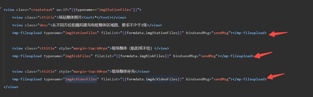 父组件 <view class="createtask"> <view class="cttitle">场站整体照片<text>*</text></view> <view class="desc">从不同方位拍摄拟建充电桩整体区域图,要求不少于2张</view> <mp-fileupload typename="imgStationFiles" fileList="{{formdata.imgStationFiles}}" bindsendMsg="sendMsg"></mp-fileupload> <view class="cttitle" style="margin-top:60rpx">现场整体(航拍或手绘)</view> <mp-fileupload typename="imgRiskFiles" fileList="{{formdata.imgRiskFiles}}" bindsendMsg="sendMsg"></mp-fileupload> <view class="cttitle" style="margin-top:60rpx">现场整体补充</view> <mp-fileupload typename="imgAcVideoFiles" fileList="{{formdata.imgAcVideoFiles}}" bindsendMsg="sendMsg"></mp-fileupload> </view> 子组件 <!--pages/components/fileUpload/fileUpload.wxml--> <view class="uploaderbox"> <van-uploader accept="media" max-count="20" multiple file-list="{{ fileList }}" bind:delete="deleteRead" bind:after-read="afterRead"> <view class="uploader"> <!-- <van-icon class="plus" name="plus" /> --> 点击上传 </view> </van-uploader> </view> // pages/components/fileUpload/fileUpload.js const Request = require("../../utils/request"); //导入模块 var that var successNum = 0 Component({ /** * 组件的属性列表 */ properties: { fileList: { type: Array, value: [], observer(nv, ov, path) { console.log(nv); } }, typename: { type: String, value: '', observer(nv, ov, path) { console.log(nv); } } }, pageLifetimes: { // 组件所在页面的生命周期函数 show: function () { that = this }, hide: function () {}, resize: function () {}, }, /** * 组件的初始数据 */ data: { // fileList: [] }, /** * 组件的方法列表 */ methods: { afterRead(event) { const { file } = event.detail; for (let i = 0; i < file.length; i++) { if (file[i].duration && file[i].duration < 5) { wx.showToast({ title: '视频不能小于5秒', icon: "none", mask: true, }) return } } console.log(that.data.fileList); const fileList = that.data.fileList //获得这次上传的图片数量,上传时避免重复上传之前传过的文件 const thatNum = file.length const beforeNum = fileList.length const totalNum = thatNum + beforeNum //还没上传时将选择的图片的上传状态设置为加载 for (let j = 0; j < thatNum; j++) { file[j].status = 'uploading' fileList.push(file[j]) } that.setData({ fileList }) //上传服务器 for (let i = beforeNum; i < totalNum; i++) { that.uploadImg(i, that.data.fileList[i].url, that, thatNum) } }, uploadImg(fileListIndex, fileURL, that, thatNum) { //上传文件 const filePath = fileURL // 小程序临时文件路径 wx.uploadFile({ url: `${Request.apiHttp}/psp/api/ifs/upload`, filePath: filePath, name: 'dhefile', header: { 'dhetoken': wx.getStorageSync("UserSessionId"), }, formData: { appCode: 'icc' }, success(res) { successNum++ var tem = JSON.parse(res.data) // 上传完成需要更新 fileList that.setData({ [`fileList[${fileListIndex}].url`]: tem.data.httpUrl, [`fileList[${fileListIndex}].status`]: 'done', [`fileList[${fileListIndex}].id`]: tem.data.id }) console.log(that.data.typename); if (successNum === thatNum) { that.triggerEvent('sendMsg', { fileList: that.data.fileList, typename: that.data.typename }) } }, fail: function (res) { console.log("file upload fail") }, }) }, deleteRead(e) { let fileList_index = e.detail.index //fileList下标 that.data.fileList.splice(fileList_index, 1) that.setData({ fileList: that.data.fileList }) that.triggerEvent('sendMsg', { fileList: that.data.fileList, typename: that.data.typename }) }, } })