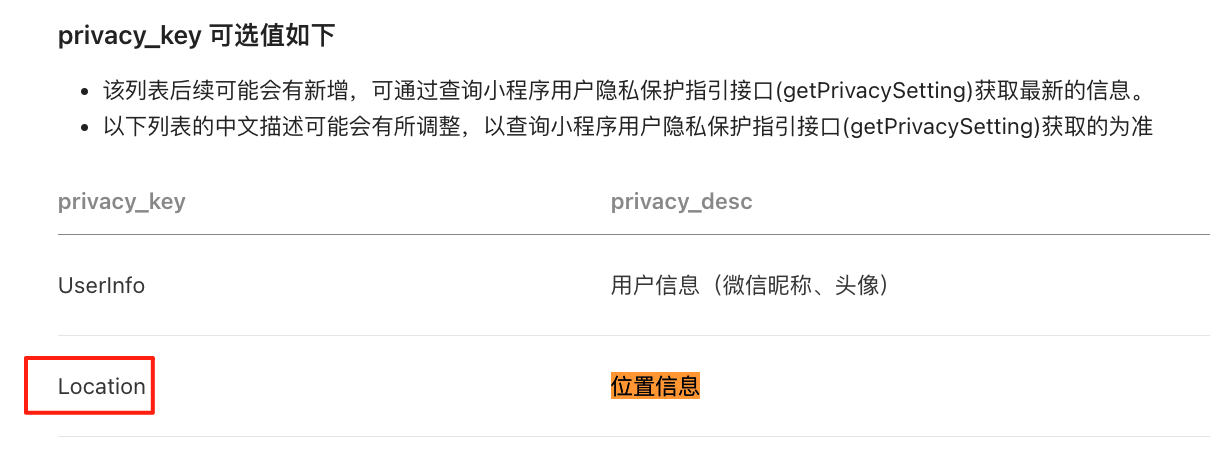第三方代开发小程序,接口配置隐私对应的 privacy_key 是 Location :https://developers.weixin.qq.com/doc/oplatform/openApi/OpenApiDoc/miniprogram-management/privacy-management/setPrivacySetting.html#privacy-key-%E5%8F%AF%E9%80%89%E5%80%BC%E5%A6%82%E4%B8%8B