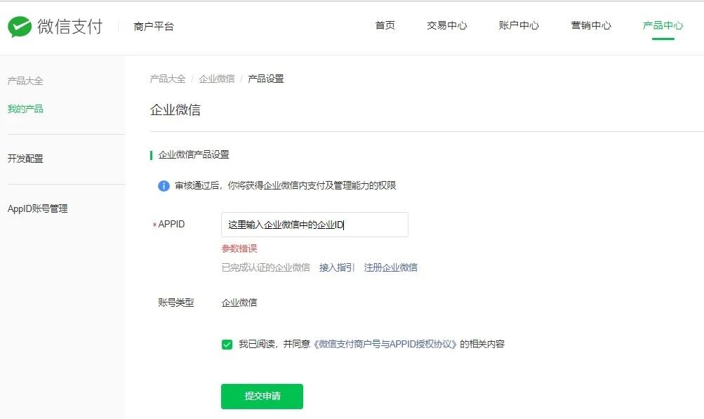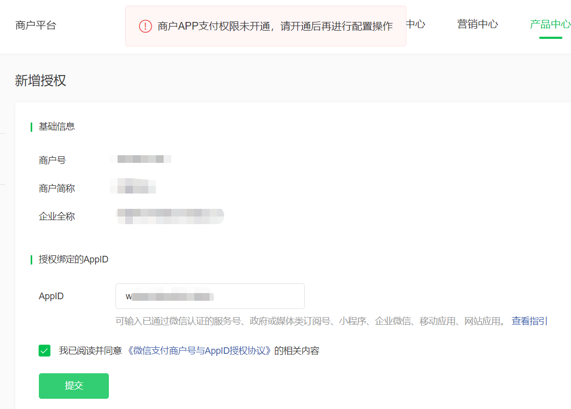 先在产品中心开通APP支付权限