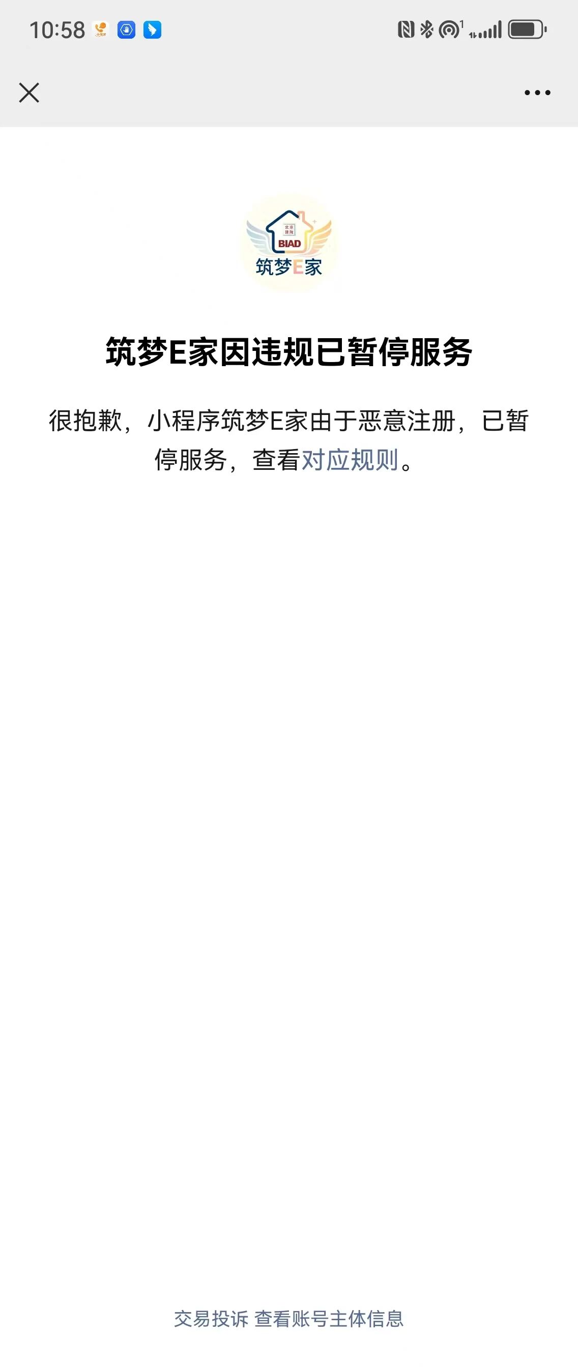 请求平台立即核查,解除对“筑梦E家”小程序和"阅小会2"小程序的永久封禁,恢复正常使用权限小程序ID:wx159dc89c582fb354 , wxd4c6435f8251fdb8 ,小程序因“恶意注册”被永久封号,此判定与实际情况不符,请解除封禁。