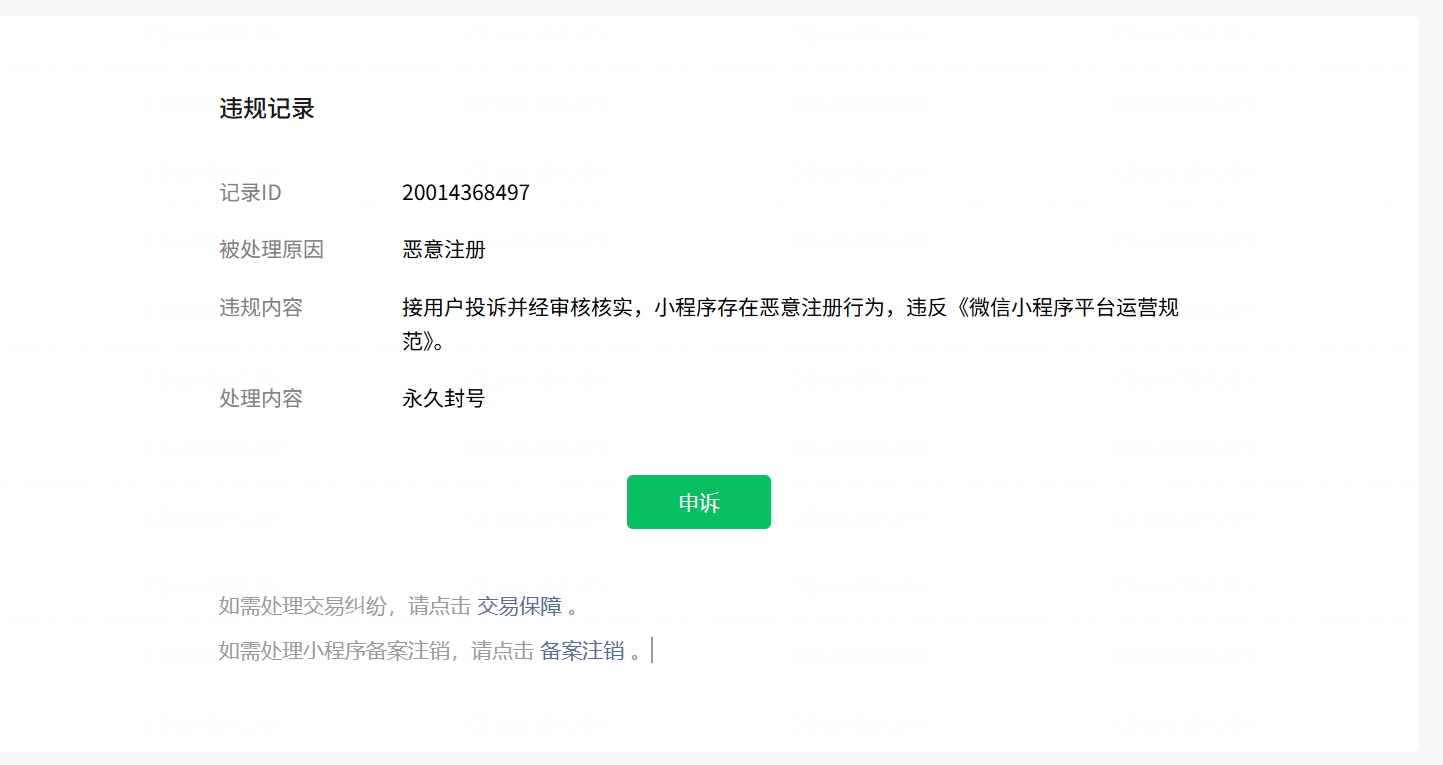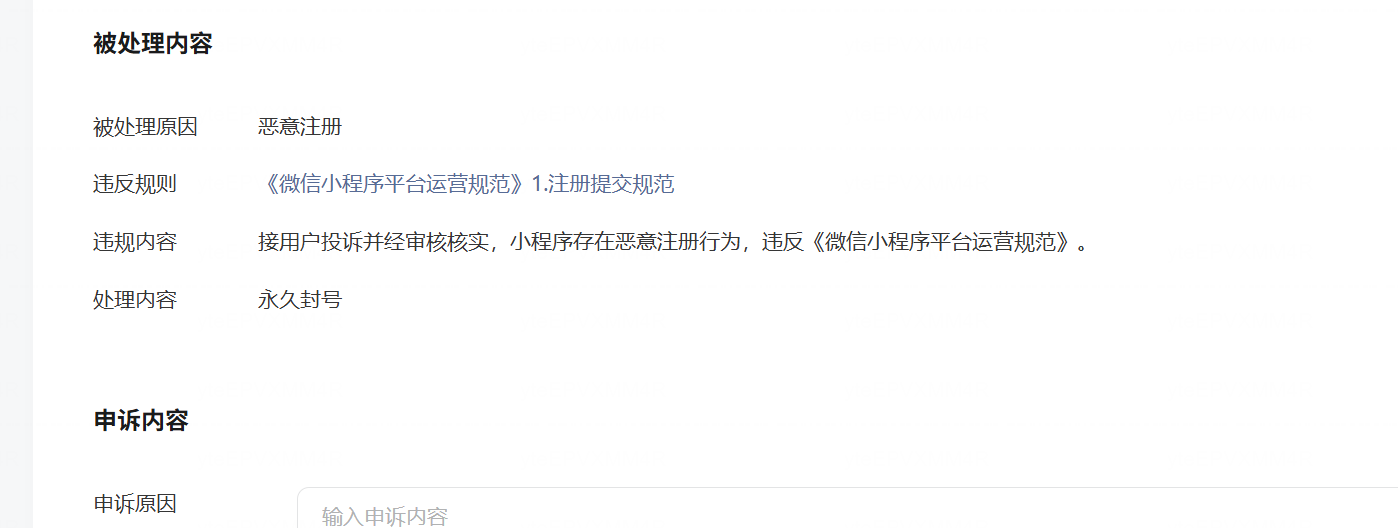 小程序ID:wx159dc89c582fb354 , wxd4c6435f8251fdb8,小程序因“恶意注册”被永久封号,此判定与实际情况不符,请解除封禁。 当前已经对我们造成损失用户损失,请尽快回复 ,并且当前已经进不去页面 看不了站内信