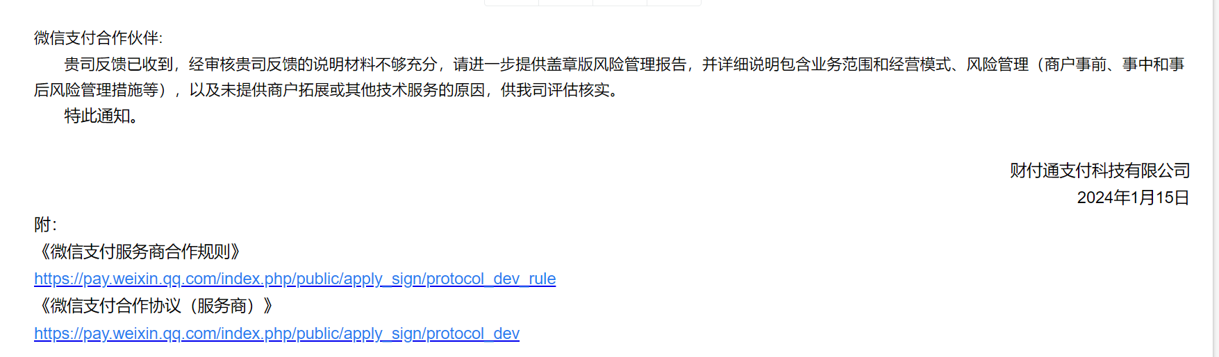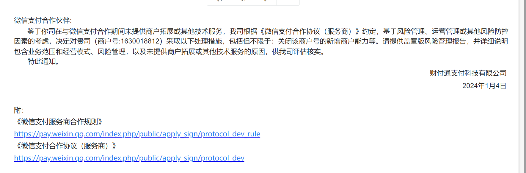 1、收到邮件说我司因为没有拓展商户和提供技术服务所以关停了新增商户功能,要求提供一系列申诉材料
