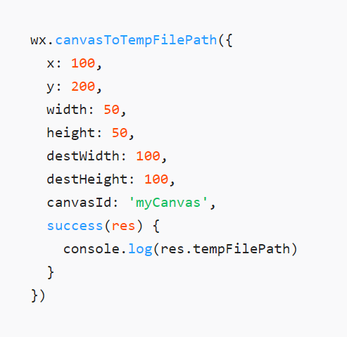 把当前画布指定区域的内容导出生成指定大小的图片。在draw()回调里调用该方法才能保证图片导出成功。