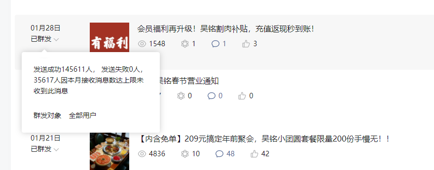 同问,我也遇见了,就很疑惑,为什么每月最后一次推文总会提示有几个或者十几个客户消息接收数达上限,未收到,,,,这个消息数是只指群发消息的嘛?如果是的话,我四次机会也没用完,,,怎么会有客户接收数用完了呢,,,如果不单指群发消息数,那还有哪些消息包含在内的,可以给个官方答案嘛?