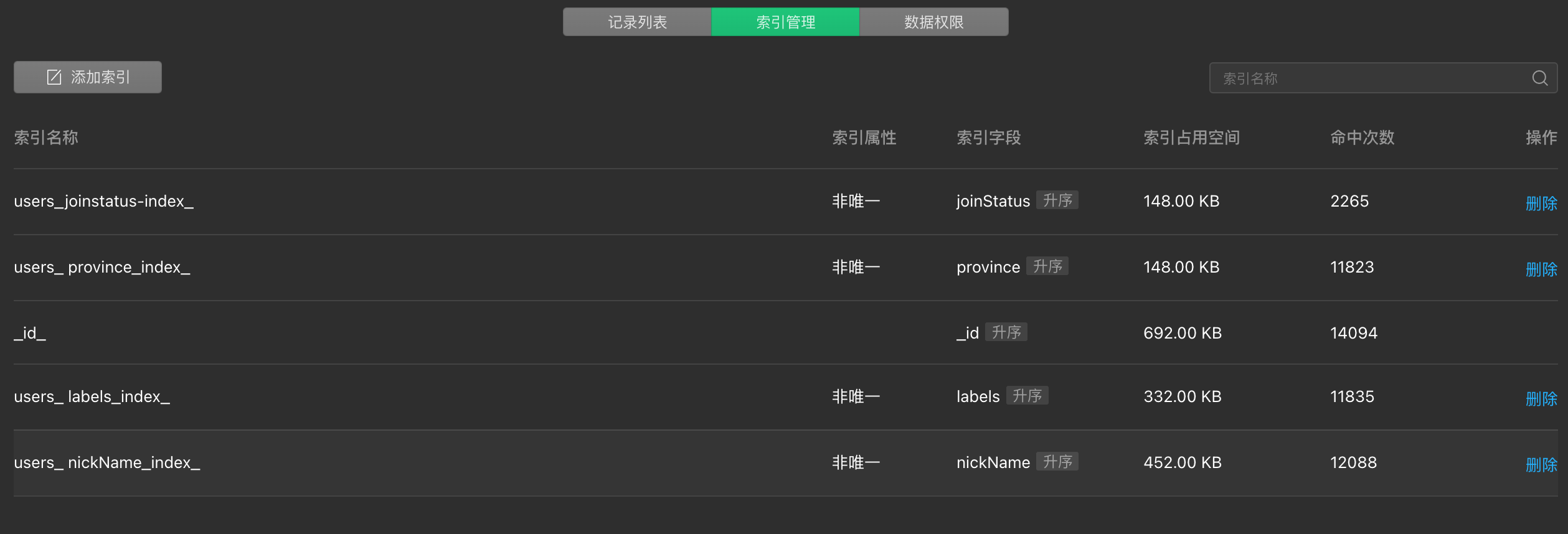 添加索引这里无法建立openId 索引,其他的都可以,见下图