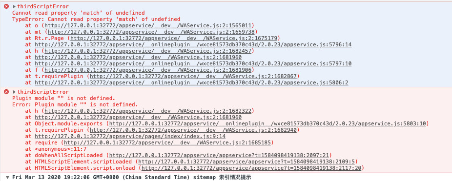 是不是有页面没有添加到插件的 pages 列表里?看看和这个问题一样不 https://developers.weixin.qq.com/community/develop/doc/000aca1d8f041894323954a9651000