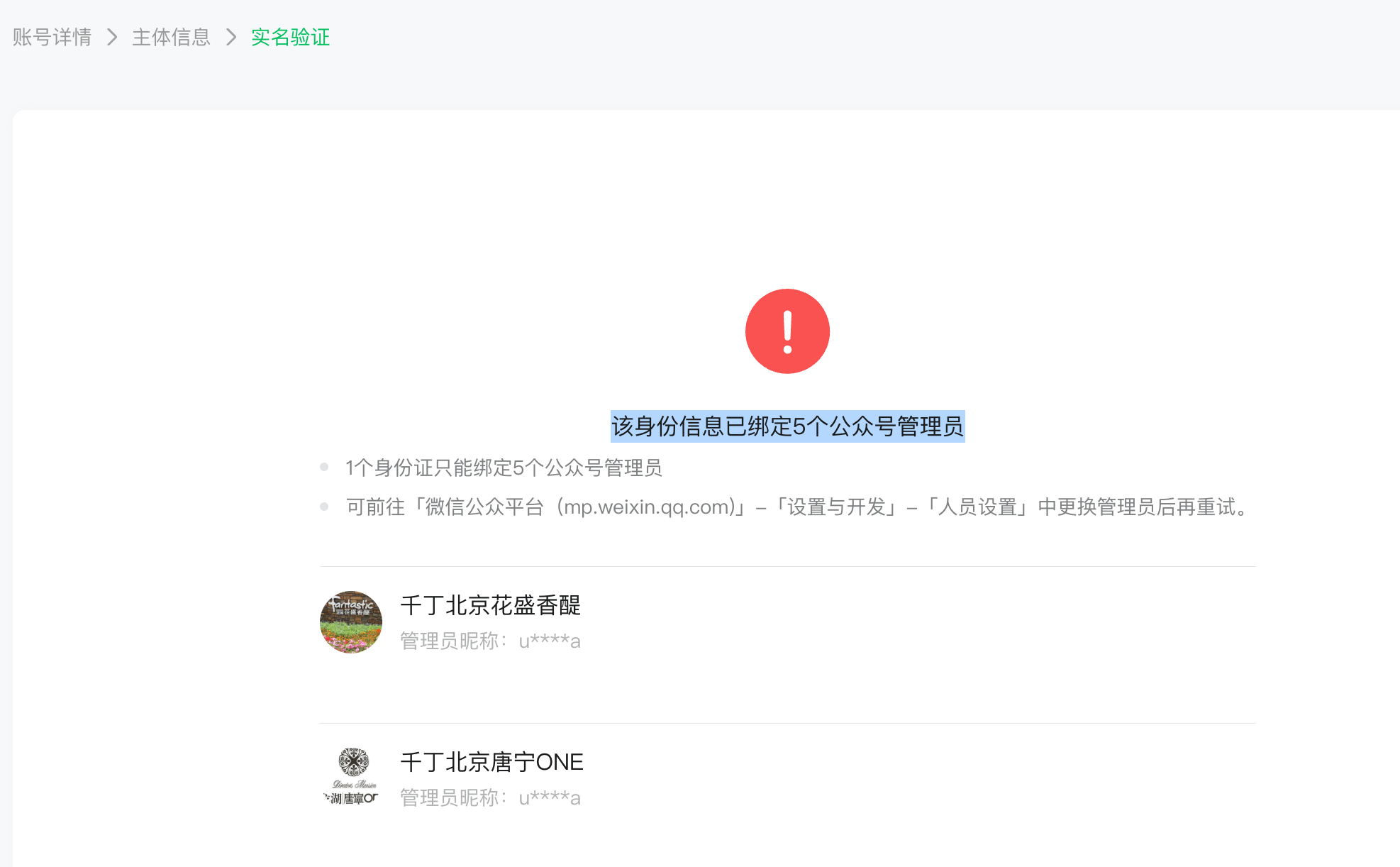 但实名认证出现如下提示,目前也无法联系到之前的管理员进行解绑,公司已经解散,好多微信号都是当时公司注册的。本人认证进入死循环。