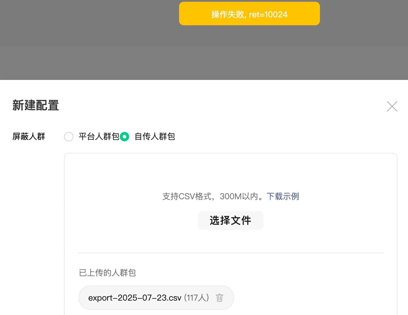 流量主-封面广告播控,人群包播控设置报错[ret=10024]