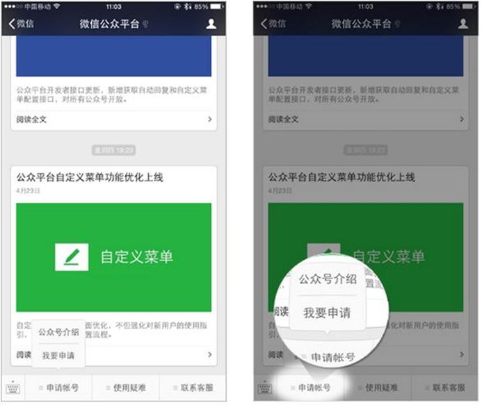 公众帐号可以在会话界面底部设置自定义菜单,菜单项可按需设定,并可为其设置响应动作。用户可以通过点击菜单项,收到您设定的响应,如收取消息、跳转链接。