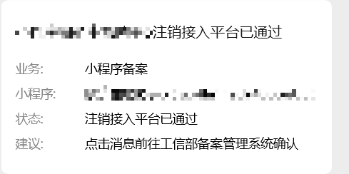 昨天提交注销微信小程序备案的申请之后收到消息“小程序注销接入平台已通过”建议我前往工信部备案管理系统确认,点进去啥也没有,只能查到上一个主体备案信息,然后想要申请新的备案,又跟我说已有备案申请处理中,请等待申请完成后,再行发起备案申请。所以我现在只需要等待吗?也看不到注销的进度流程啥的......