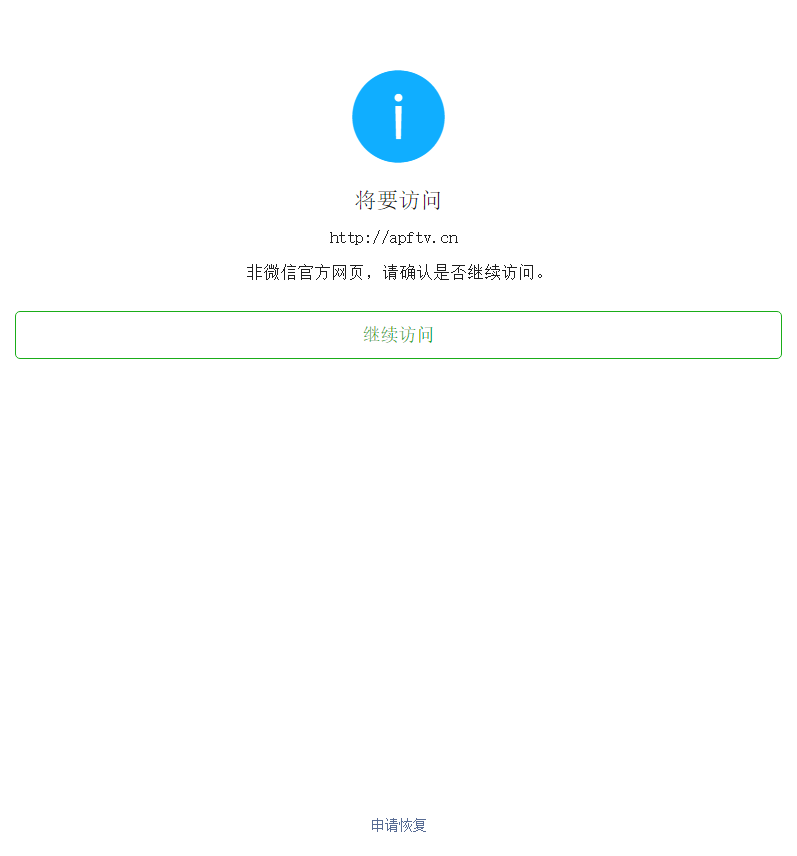 大家好,公司新注册的域名apftv.cn,在微信访问提示:非官方网页,请确认是否继续访问。起初以为是未备案的原因,可是备案通过后依旧不能访问,也申诉多次都没有任何反馈!备案号是:冀ICP备20001541号-1 公司名称是:保定冠智生物科技有限公司 请帮忙看下原因!
