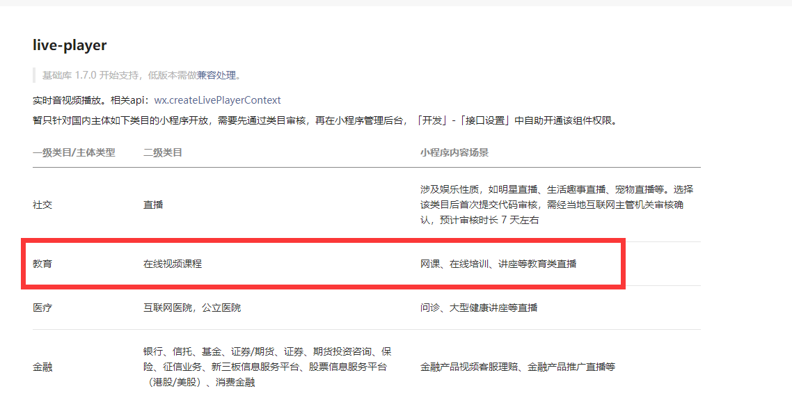 暂只针对国内主体如下类目的小程序开放,需要先通过类目审核,再在小程序管理后台,「开发」-「接口设置」中自助开通该组件权限。