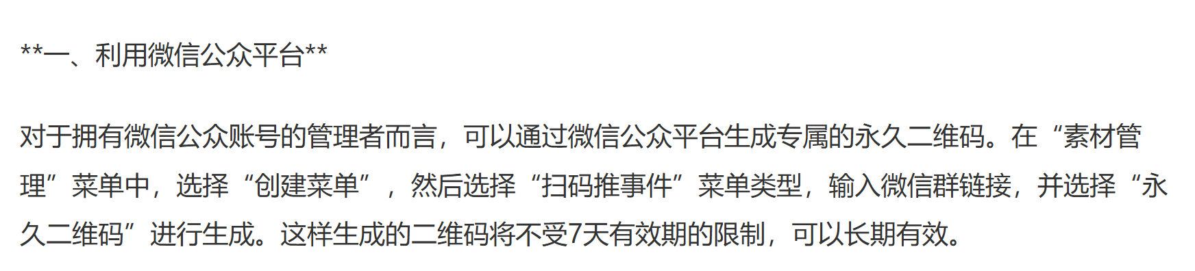一般微信群二维码只有7天有效期。我是公众号管理者,新工作需要,需要生成永久的微信群二维码。请问怎么操作?图中所说的“素材管理”没找到。