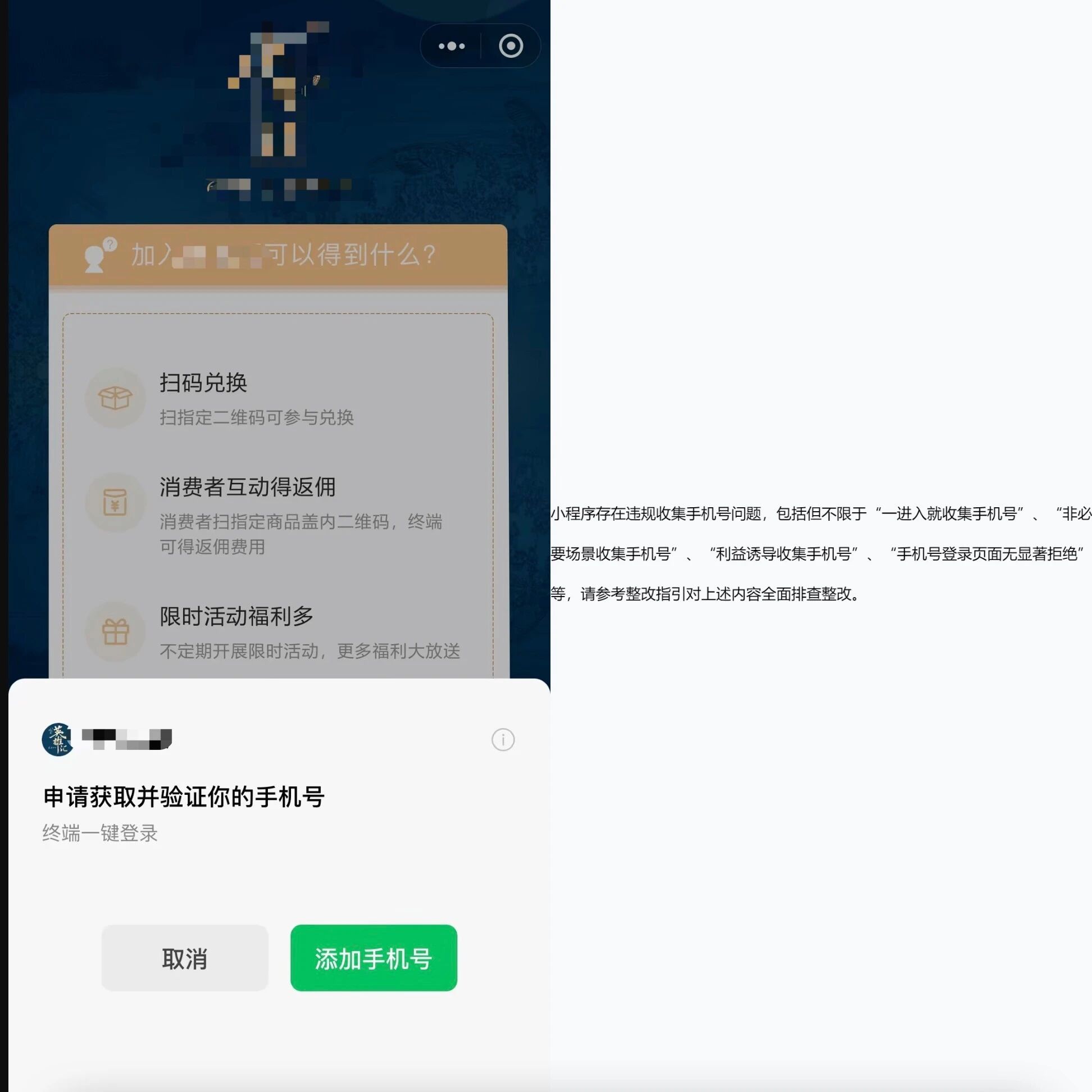 用户使用"一键登录",也不行么?并不是进入页面就会触发手机授权的,必须是用户点击按钮后才会触发弹窗提示,不知道为什么会收到违规警告,找客服也没有人回复,
