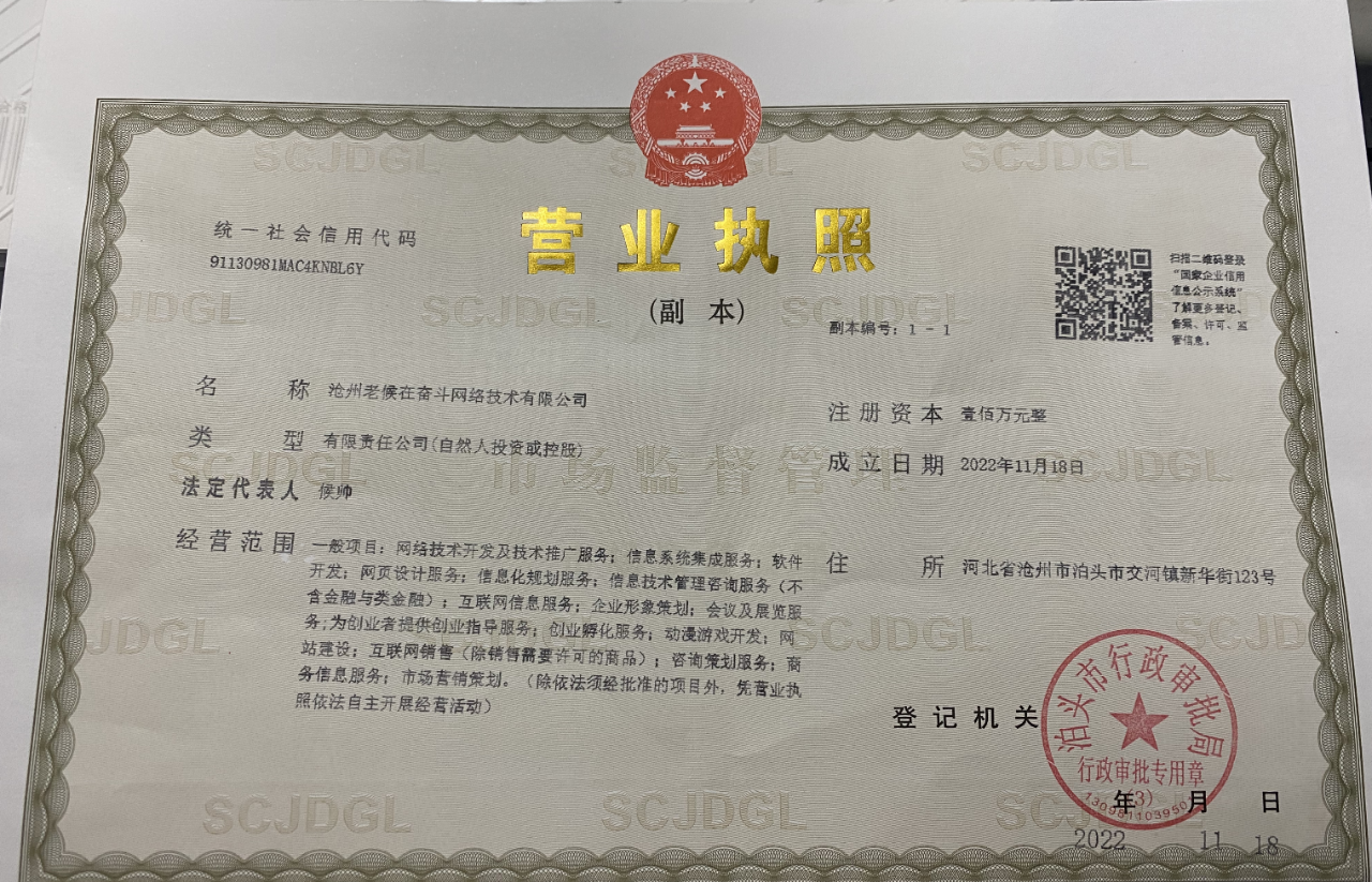 主体名称:沧州老候在奋斗网络技术有限公司
