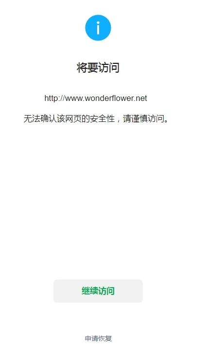 http://www.wonderflower.net 网站微信访问/扫码出现:无法确认该网页的安全性,请谨慎访问。请删除拦截,我司网站是展示产品,介绍公司内容