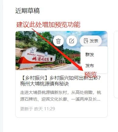 【问题描述】: 建议“预览”不用打开草稿,在“发布”下方增加“预览”功能,这样更高效。