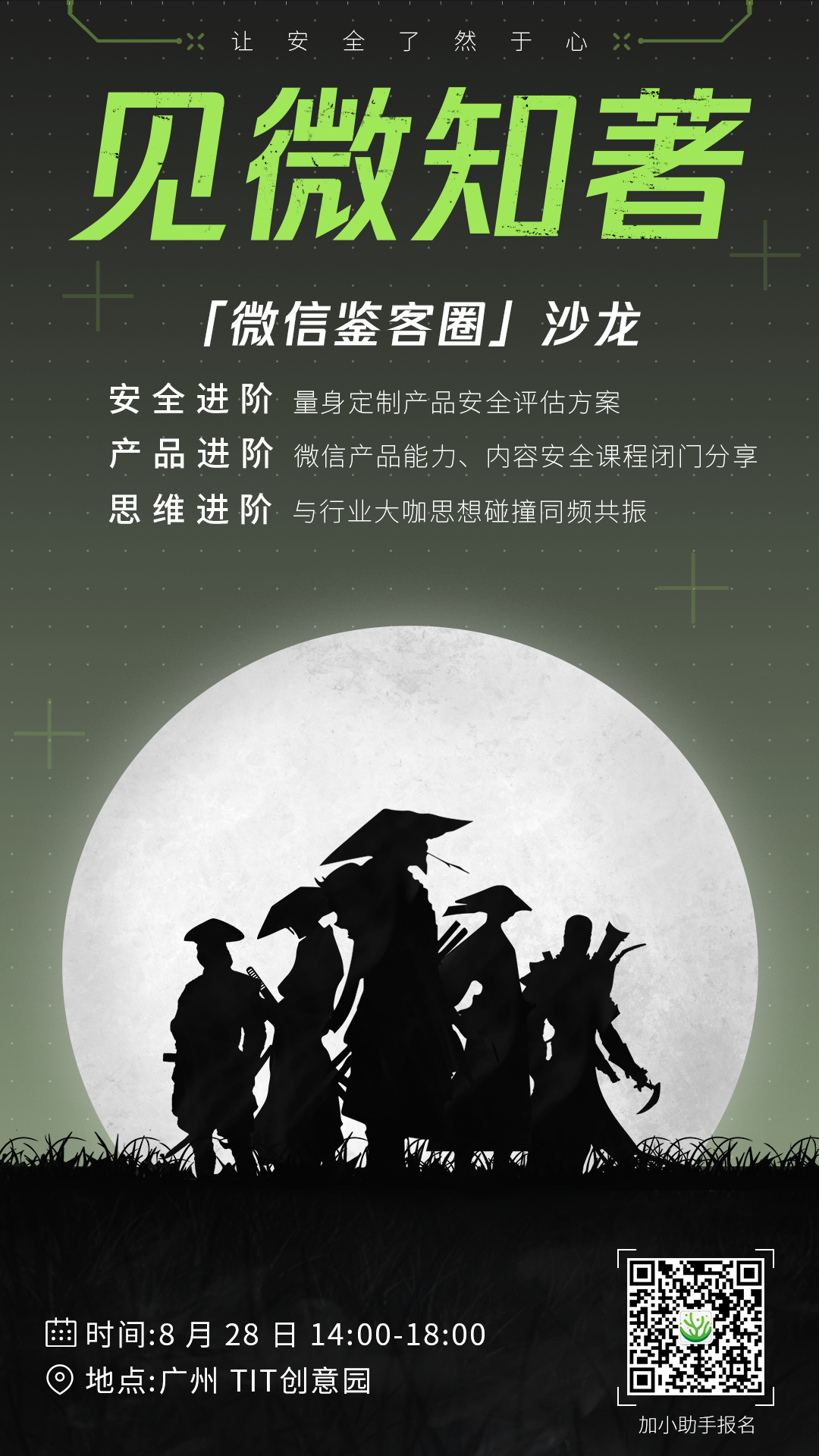 参加本次线下沙龙的同学,将有机会得到微信安全验证专家为你的产品量身定制的内容安全风险评估方案,为你的产品保驾护航。