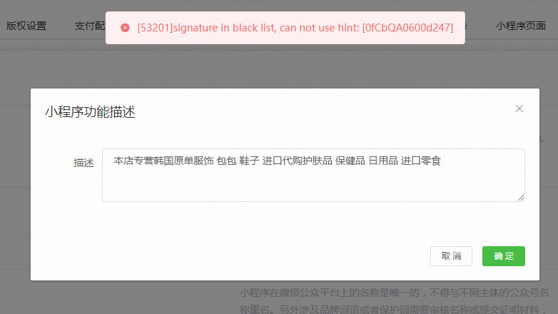 客户是人脸识别的小程序 营业执照是双十二刚办理的 为什么名字介绍修改不了呢?提示在黑名单 小程序名字也是直接提示失败