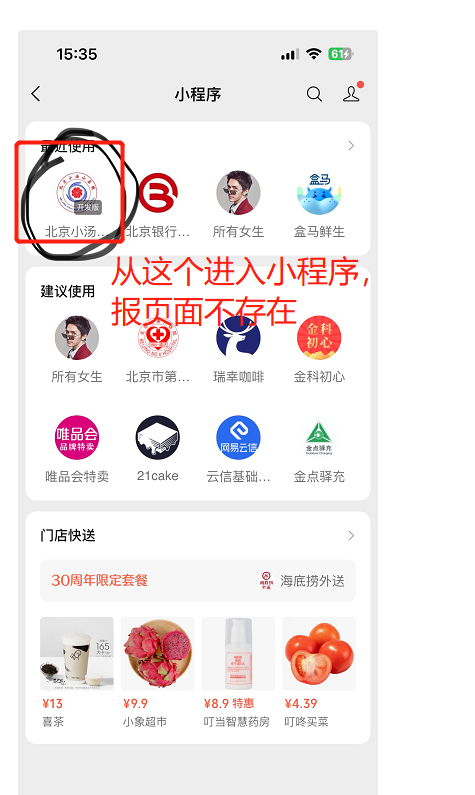 小程序开发版本从首页下拉,最近使用的小程序中点击‘小程序A’进入可正常使用,但是从发现模块-小程序-最近使用的小程序点击'小程序A'报页面不存在,此问题必现,只要从发现模块-小程序-最近使用的-进入小程序就会是页面不存在。