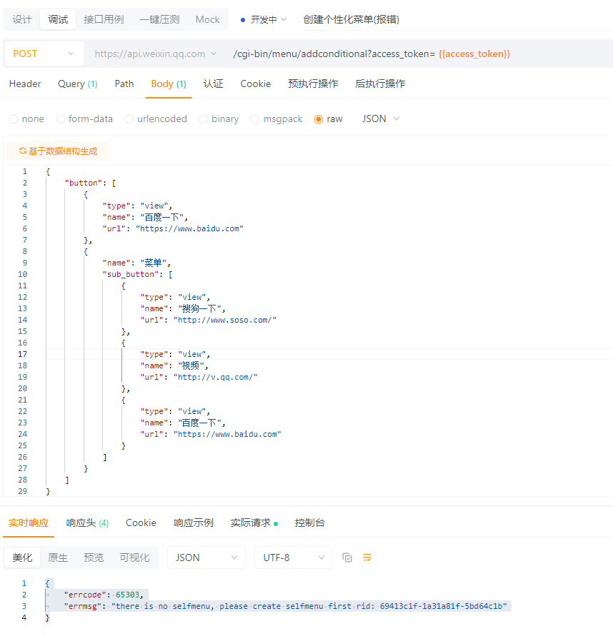 {"errcode": 65303, "errmsg": "there is no selfmenu, please create selfmenu first rid: 69413c1f-1a31a81f-5bd64c1b"}