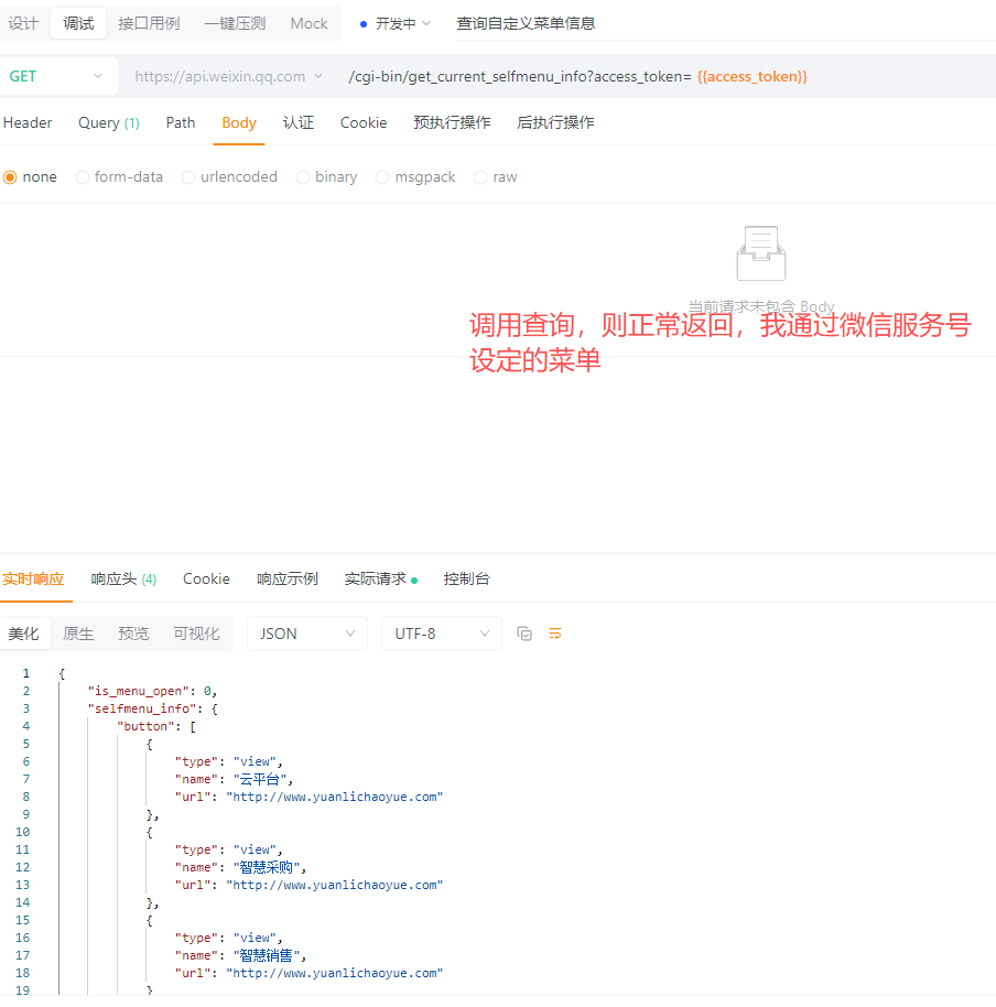 先创建了 默认菜单后。如果需要个性化需要,在调用此接口执行这个个性化菜单。