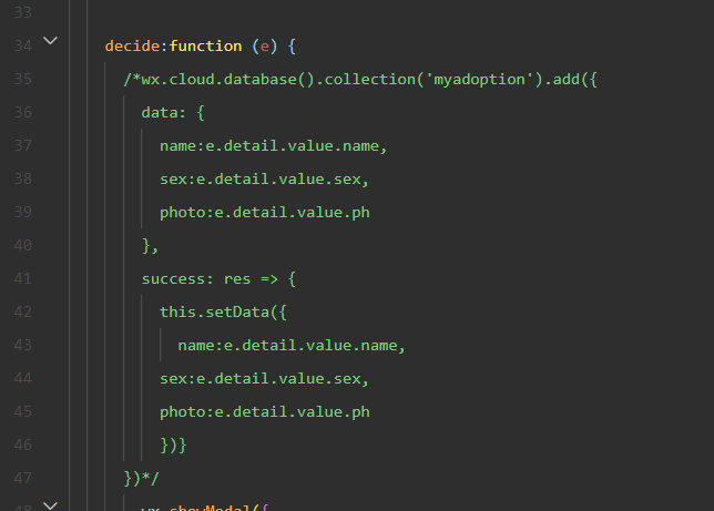 你是在onload里执行了获取数据,拿到了数据库1的数据,执行成功后,在res回调里你再执行this.decide()方法将数据add到另一个数据库,add里面的data这里就不能是e.detail.value.了,得是你从数据库1拿到的数据