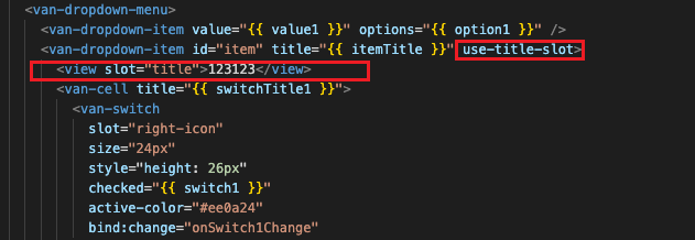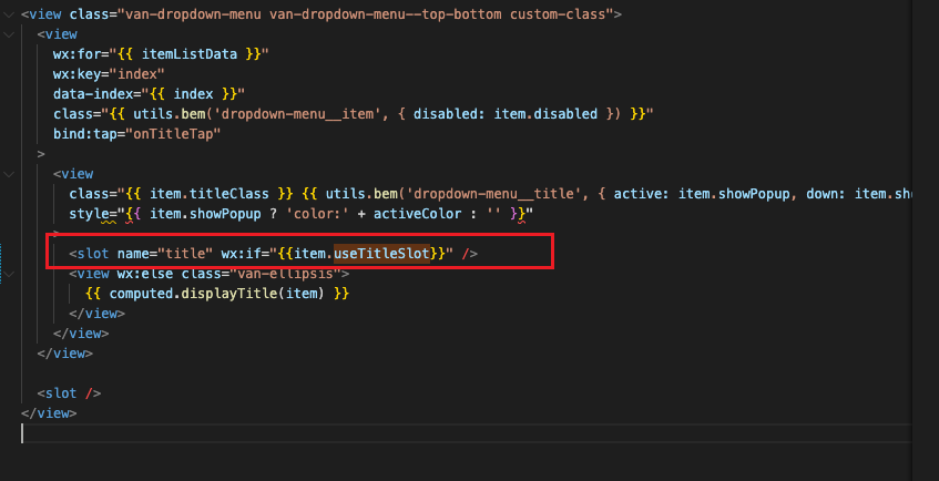 希望能在van-dropdown-item 下写这个slot 作用到上述的位置。实际操作下来不能生效,红框代码需要写到 van-dropdown-menu才能生效,但是这样的话,就不满足需求了,每一个dropdowm-item就不能独立设置自定义的title了。想问下有什么办法可以满足我的需要吗?