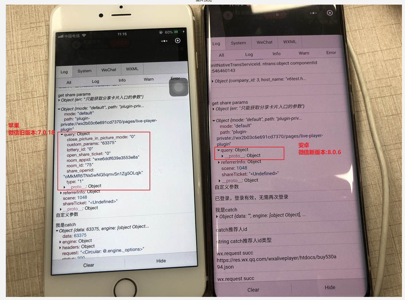直接分享直播间出去,用户扫码获取不到自定义的custom_params,高版本获取不到,低版本可以?