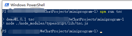 3,如上图,powershell 中在新建的 miniprogram-1 目录下执行 npm run tsc 未报错;