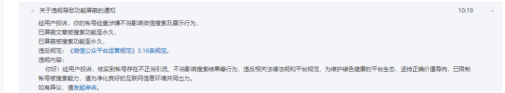 今天收到了违规提醒,封了搜索功能,具体原因是什么呢?