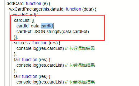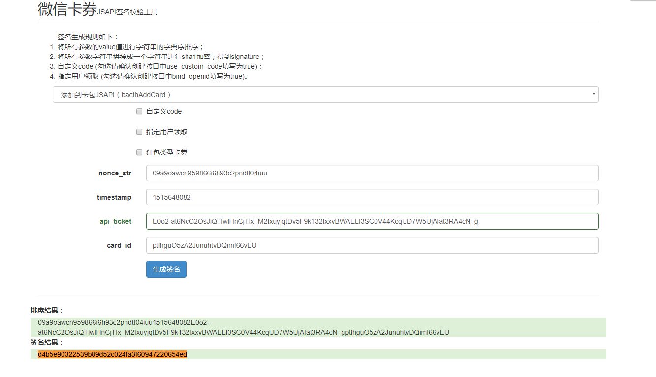 {"error":0,"msg":"","data":{"card_id":"ptlhguO5zA2JunuhtvDQimf66vEU","card_ext":{"openid":"","timestamp":1515648082,"signature":"d4b5e90322539b89d52c024fa3f60947220654ed"}}}