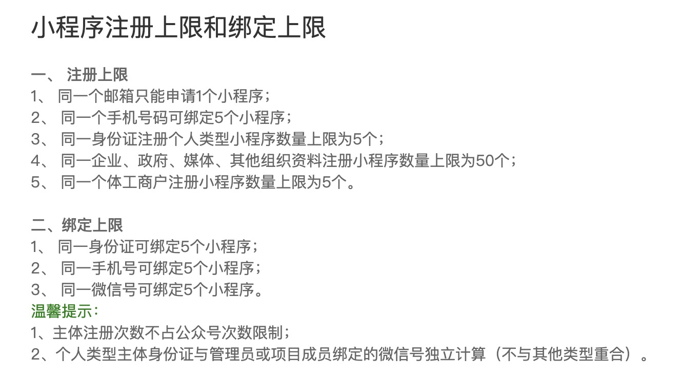 3、 同一身份证注册个人类型小程序数量上限为5个;