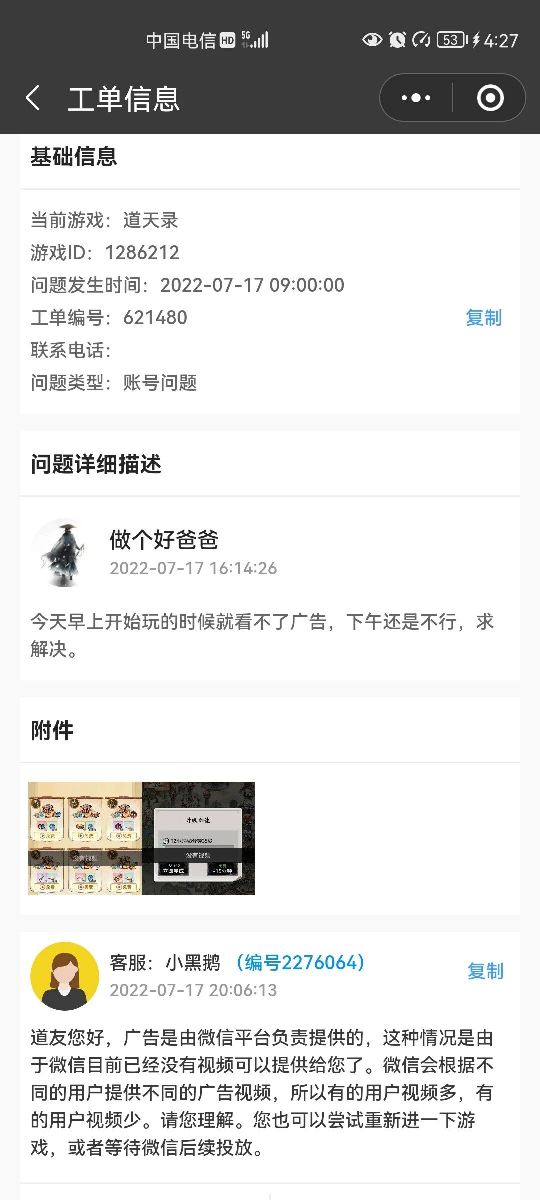 我是微信小程序游戏道天录玩家,7月10日至16日为游戏炼丹活动,玩家会集中在活动期间炼丹完成轮数获得响应奖励。因为炼丹耗时过长,玩家通过观看广告缩减炼丹时间。在活动中差5个钟离权碎片换取炼丹加成秘籍,直到15号晚上才成功兑换,16号这天炼丹看广告就特别多,7月17日00:00炼丹活动结束新活动更新。早上9:00左右我正常操作在福利阁看广告领取福利,游戏提示无视频,我将问题反馈给游戏客服,客服说广告是微信投放,他们处理不了,让我退出游戏重进尝试或者等待推送,今天第二天了还是看不了广告,提示无视频,影响正常游戏体验。在炼丹活动期间我都无异常操作,每个广告都是看完后才关闭,无任何异常操作,个人感觉活动期间可能广告看的比较多引起的。希望客服能帮处理解决下这个问题,如果不能每天领取看广告领取的福利,这号就废了,已经玩了快一个月,投入大量时间、精力、财力,想到真的挺难受的。恳请微信客服帮忙处理解决一下。