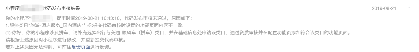 你好,经核实,贵方小程序代码涉及确实拼车,需补充选择出行与交通-顺风车(拼车)类目,或请自查代码,确保包括前端展示、小程序代码等整体均移除:相关内容,再提交代码审核。(详图如下)