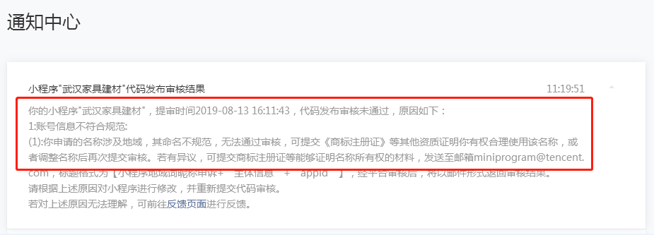 第二、我这个小程序名称是《武汉家具建材》,属于行业词,并不能注册商标,退一万步讲就算真的要商标,那么请问微信为什么没有给我一个正面的通知,而且市面上有那么多的行业词,请问他们没有商标是如何上线的?